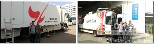 青運會五個賽區(qū)共使用了8輛轉(zhuǎn)播車,全部為索尼制作系統(tǒng),承擔(dān)了開閉幕式、福州和其他賽區(qū)重要賽事如田徑、游泳和體操等比賽的轉(zhuǎn)播活動。其中中央電視臺A車承擔(dān)了開幕式和田徑比賽的現(xiàn)場制播,福建臺轉(zhuǎn)播車承擔(dān)了男子排球和籃球的現(xiàn)場制播。