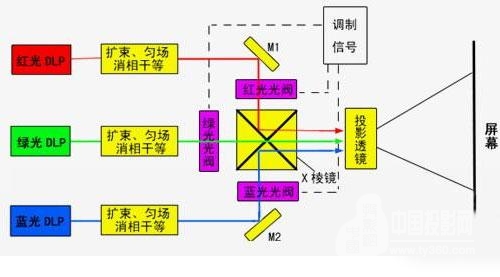 激光全色顯示技術(shù)以紅、綠、藍激光為光源,其工作原理如圖2,所示:紅、綠、藍三色激光分別經(jīng)過擴束、勻場、消相干后入射到相對應(yīng)的光閥上,光閥上加有圖像調(diào)制信號,經(jīng)調(diào)制后的三色激光由X棱鏡合色后入射到投影物鏡,最后經(jīng)投影物鏡投射到屏幕,得到激光顯示圖像。