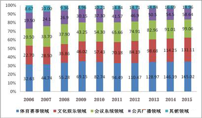 我國(guó)專業(yè)音響行業(yè)的主要下游應(yīng)用領(lǐng)域?yàn)轶w育賽事、文化娛樂、會(huì)議系統(tǒng)、公共廣播等行業(yè),得益于近年來(lái)國(guó)家宏觀經(jīng)濟(jì)的強(qiáng)勁增長(zhǎng),這些行業(yè)發(fā)展迅速,對(duì)專業(yè)音響的需求與日俱增,其在專業(yè)音響市場(chǎng)結(jié)構(gòu)中的比例也逐漸上升。2006—2010年,上述四大應(yīng)用領(lǐng)域?qū)?A target=_blank>專業(yè)音響的需求取得了穩(wěn)步增長(zhǎng),而受益于國(guó)內(nèi)文體事業(yè)的蓬勃發(fā)展,體育賽事、文化娛樂領(lǐng)域更是增長(zhǎng)強(qiáng)勁,從2006年開始就占據(jù)了53.20%的市場(chǎng)份額。