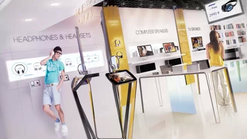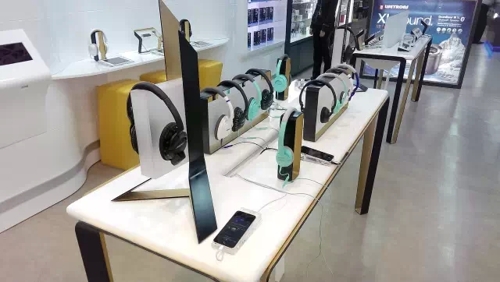 店鋪的布局也遵循了同樣的創(chuàng)意。我們把產(chǎn)品體驗(yàn)放在中心區(qū)域,四周的墻面作為陳列!奥眯屑业倪x擇”用來重點(diǎn)突出適合旅行的產(chǎn)品。黑色與金色融合的金屬絲帶挑戰(zhàn)了任何現(xiàn)存的聲音產(chǎn)品展示方式。意在用輕盈的展示表達(dá)未來感。