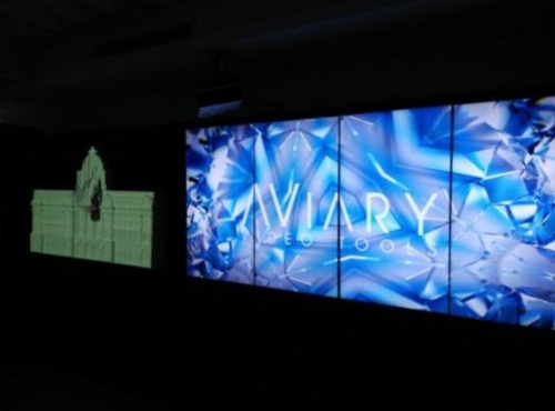1樓動態(tài)展廳搭建了配合Hippotizer的迷你建筑投影模型,從設(shè)計到素材制作全部由公司團(tuán)隊制作完成,背景模型參考外灘匯豐銀行大樓進(jìn)行設(shè)計,使客戶在展廳即可參觀通過媒體服務(wù)器配合投影機(jī)營造的建筑投影特效。邊上也有用Aviary的4K媒體播放器Parakeet連接4塊拼接屏進(jìn)行超高清片源的播放。