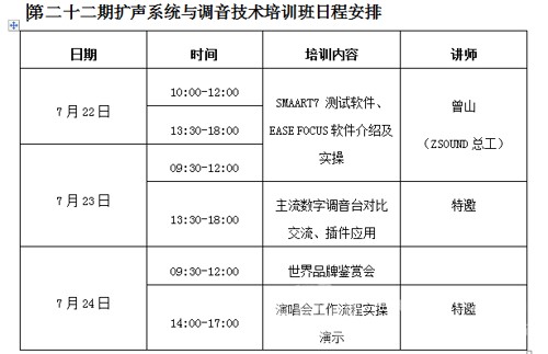 ZSOUND聯(lián)合深圳聚圳空間(ZSOUND演出聯(lián)盟單位),定于2015年7月22日至24日舉辦第二十二期擴(kuò)聲系統(tǒng)與調(diào)音技術(shù)培訓(xùn)班。本次培訓(xùn)班人數(shù)約80人,為保證授課質(zhì)量,報(bào)名名額超過(guò)80人即截止報(bào)名。