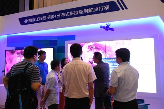 而“4k旗艦工程顯示器+分布式拼接應用解決方案”當之無愧成為活動當天最具有磁場吸引力的方案之一,現場4臺2*2超窄屏系列4K旗艦工程顯示器X554UNS進行拼接,同時與一臺98寸4K旗艦工程顯示器X981UHD進行對比,擁有高達3840 ×2160的4K分辨率,保證了超清的畫質效果,捕獲了觀眾的注意力,加之NEC特有的專用色彩引擎配合SpectraView Ⅱ軟件可以對顯示器進行亮度,黑場亮度,色彩空間,白點,Gamma曲線做精確的色彩調節(jié),輕松快捷實現專業(yè)色彩管理,引領了一個新時代的視覺體驗。