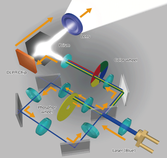 技術(shù),機(jī)器內(nèi)置一個(gè)熒光輪和一個(gè)四色色輪,藍(lán)色激光通熒光色輪轉(zhuǎn)換成黃色和綠色以及一部分純藍(lán)色激光,再通過四色的色輪進(jìn)行色彩轉(zhuǎn)換和濾光,實(shí)現(xiàn)色彩鮮艷的畫面。