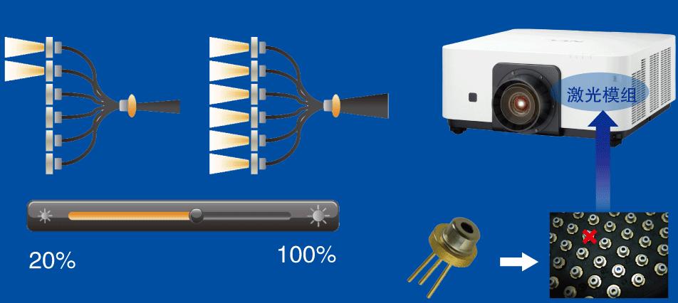 亮度調(diào)節(jié)、激光光源采用多模組結(jié)構(gòu),如果有一個(gè)激光二極管出現(xiàn)故障,對(duì)整體