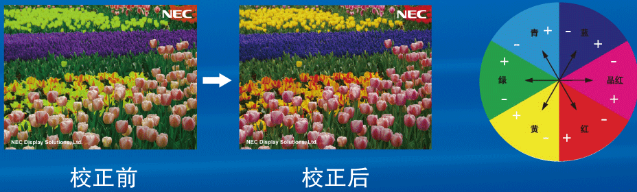 校正技術(shù),實(shí)現(xiàn)每種色彩的色相進(jìn)行獨(dú)立的調(diào)整,對(duì)于多臺(tái)同時(shí)使用的投影機(jī)由于長時(shí)間使用后產(chǎn)生的色彩不一致現(xiàn)象,能夠?qū)崿F(xiàn)準(zhǔn)確的色相