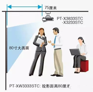短焦投影機不僅是助推教育信息化的新動力,還是小型會議室不可或缺的道具。新品PT-X3833STC短焦系列不但秉承了松下短焦投影機一貫的優(yōu)異性能,還在原有功能上進行了優(yōu)化升級。新品短焦投影機三大看點:卓越性能、出色表現(xiàn)PT-X3833STC和PT-X3233STC投影機僅需75厘米投影距離即可投射80寸大畫面。近距離投影避免使投影圖像上出現(xiàn)陰影,同時避免強光直射人眼,使課堂講演和會議演示更加方便自如。3200~3800流明的高亮度和12000:1的高對比度實現(xiàn)明亮、清晰的投影效果,拓寬了投影機的適用環(huán)境和應(yīng)用范圍。此外,如下圖所示,本系列新品具有更長的燈泡和空氣過濾網(wǎng)更換周期,降低了維護成本。