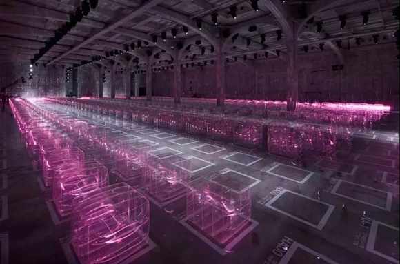 當(dāng)上方的白光燈將光線集中打在舞臺(tái)上時(shí),雪花型的小斑點(diǎn)就開(kāi)始飄落在時(shí)裝行走道周圍。音頻配樂(lè)響起,增加整體氛圍—混合音樂(lè)來(lái)自于知名小說(shuō)改編電影《銀翼殺手》和《星際》中的配樂(lè),讓個(gè)環(huán)境因?yàn)榍把貢r(shí)尚人物而充滿了超現(xiàn)實(shí)的反烏托邦感。