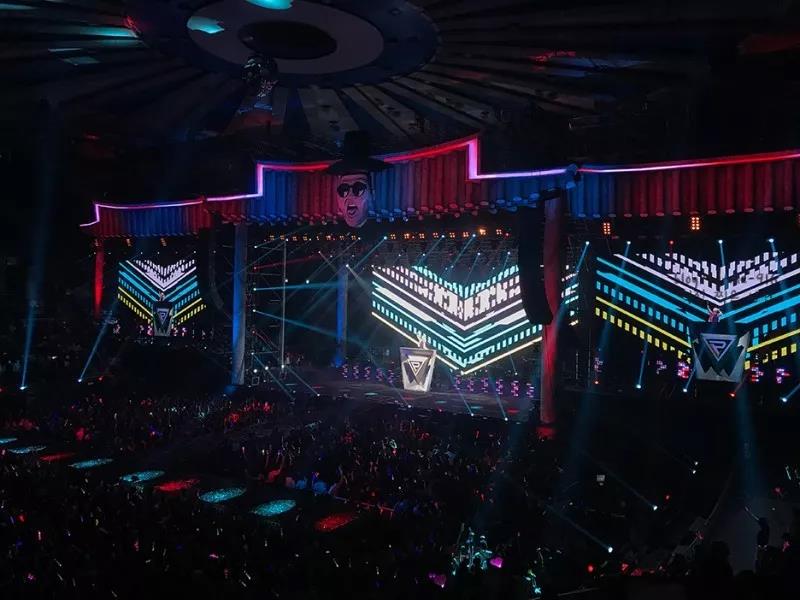 其中深入到現(xiàn)場(chǎng)觀眾人群的“T”型舞臺(tái),能近距離接觸觀眾,與觀眾進(jìn)行實(shí)時(shí)互動(dòng)。特別是其中由定制升降舞臺(tái)組成的部分,更是鳥(niǎo)叔演唱會(huì)的大殺器,不僅覆蓋表演區(qū)和遠(yuǎn)景區(qū),還帶來(lái)了十分震撼的現(xiàn)場(chǎng)效果,一下就將演唱會(huì)氣氛推向高潮。