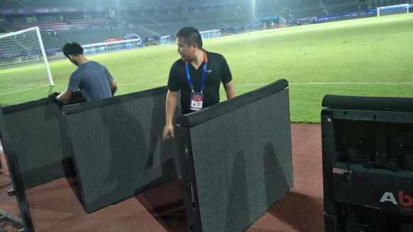 超極杯結(jié)束之后等待球員采訪完成,還未來(lái)得及看幾眼世界級(jí)球員的工程師馬上開(kāi)始組織指導(dǎo)工人拆卸設(shè)備。因?yàn)?月8日第六輪足協(xié)杯江蘇蘇寧對(duì)陣廣州富力,主場(chǎng)就在南京奧體中心,所以艾比森的球場(chǎng)LED設(shè)備必需第二天運(yùn)回南京奧體中心,進(jìn)行安裝調(diào)試。