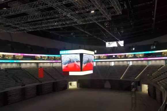 在體育館中央上方的LED斗型屏采用四面圍繞的環(huán)形設計,猶如巨大的星幕,散發(fā)出耀眼的光芒,由上海三思設計制造完成。四塊LED屏每塊屏幕高4米,寬7米,總面積為112㎡,四面環(huán)繞。