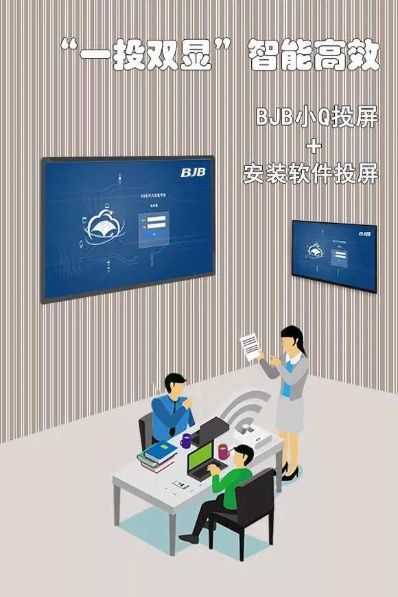 對于Windows版本設備使用Q-Share,可實現(xiàn)“一投雙顯”,即筆記本通過插入小Q可以將內(nèi)容投屏到一塊屏幕,再通過安裝投屏軟件利用本身無線網(wǎng)卡將屏幕內(nèi)容投屏到另一塊屏幕。如果您的會議室面積較大且與會人數(shù)眾多時,這個功能可以助您一臂之力。