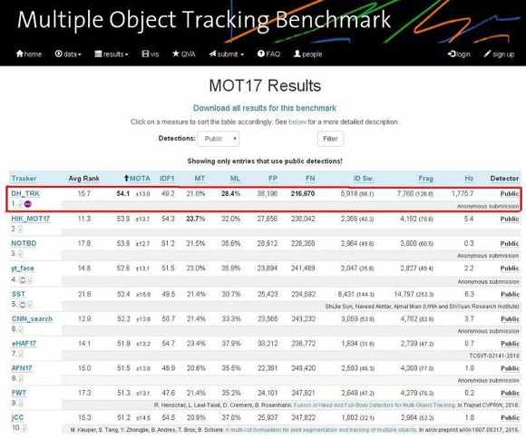 近日,大華股份基于深度學習技術(shù)研發(fā)的目標跟蹤技術(shù),刷新了Multiple Object Tracking (MOT)競賽的全球最好成績,取得了行人多目標跟蹤排行榜第一名,超越其它一流的AI公司和頂尖的學術(shù)研究機構(gòu),以及CVPR 2018年度最佳目標跟蹤研究成果,這標志著大華股份在目標跟蹤領域處于世界領先水平。