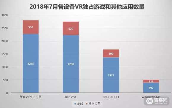 VR獨(dú)占內(nèi)容中,VR游戲有2275款,占比81.1%。其中2230款游戲支持HTC Vive,1373款游戲支持Oculus Rift,397款游戲支持Windows MR。