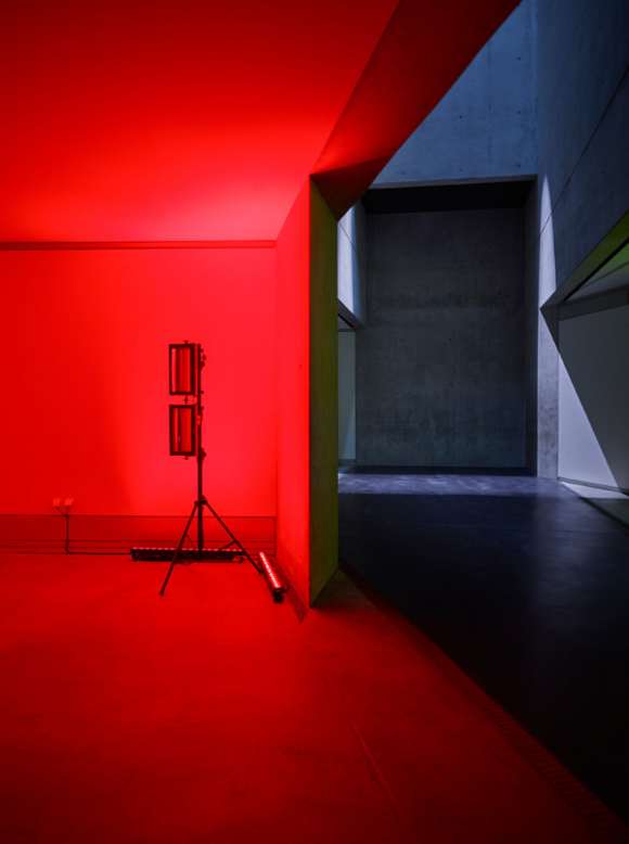 Rotating projectors cast light fields onto walls and ceiling;photo:Ladislav Zajac/Archiv Mischa Kuball,Düsseldorf/VG Bild-Kunst,Bonn 2017