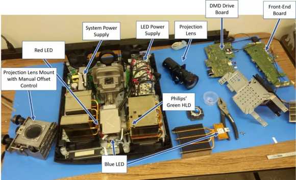李俐表示:飛利浦投影事業(yè)部走LED光源這條路線,主要原因是LED的色彩表現(xiàn)好。我們投入了大量的研發(fā)經(jīng)費(fèi),HLD并不是對LED簡單的改造,而是全新的創(chuàng)新,相較于原來的LED芯片,HLD模組最大的優(yōu)勢就是亮度的大幅提升。HLD的核心技術(shù)是芯片里的光棒,光棒里面按照一定的化學(xué)工藝填充了轉(zhuǎn)換的化學(xué)物質(zhì),光棒上下兩面貼上藍(lán)色的LED芯片,發(fā)出藍(lán)色光并投射到光棒上,再轉(zhuǎn)換成綠、黃、紅等各種需要的顏色光進(jìn)行收光,這種架構(gòu)的好處就是實(shí)現(xiàn)了亮度的急劇提升。光源亮度這個(gè)技術(shù)門檻的突破,讓品牌廠商看到了機(jī)會(huì)。