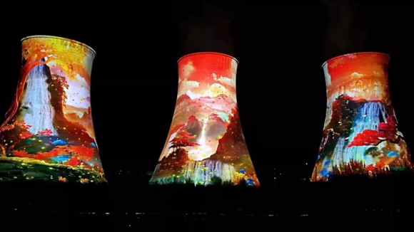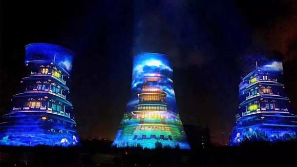 演出場(chǎng)地背景為三座近百米的高塔,投射光影面積達(dá)到15000平米。