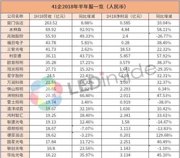 時(shí)至八月末,A股上市企業(yè)中報(bào)披露已接近尾聲。近期LED上中下游相關(guān)企業(yè)扎堆交出2018年半年度成績(jī)單。據(jù)LEDinside不完全統(tǒng)計(jì),截至8月31日,累計(jì)共有41家LED相關(guān)企業(yè)披露了業(yè)績(jī),頗具看點(diǎn)。LED上中下游的代表三安光電、木林森及歐普照明紛紛交出亮眼業(yè)績(jī)單。