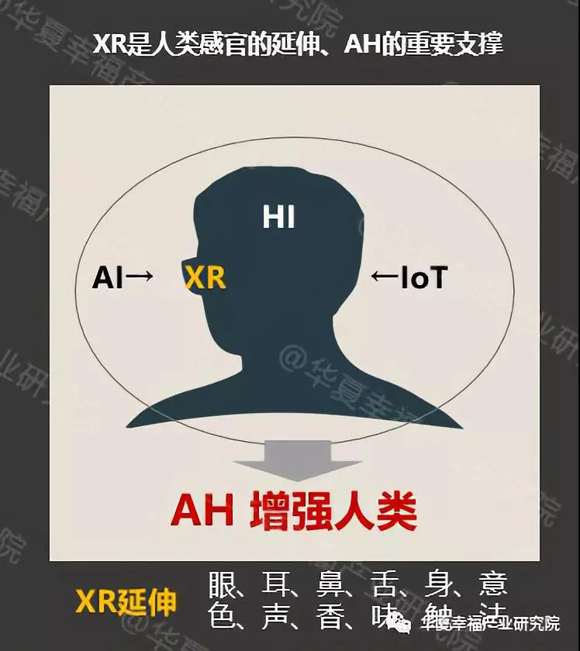 要想看透XR在各個垂直領(lǐng)域的應(yīng)用,首先應(yīng)看懂XR如何塑造AH(增強(qiáng)人類)——人與AI、XR、IoT三者結(jié)合后,感知、判斷、決策、執(zhí)行能力得到全面提升和強(qiáng)化,其中,AI需與HI(人類智能)充分結(jié)合,IoT把物體數(shù)據(jù)傳輸給人,XR則通過改善、放大或延伸眼、耳、鼻、舌、身、意等感知能力來幫助人類捕捉虛實(shí)疊加的世界。