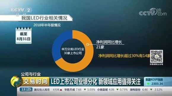 截至8月31日,今年中報業(yè)績中,申萬分類LED行業(yè)30家上市公司中,21家公司凈利潤同比增長,其中凈利潤同比增長超過30%的有14家,凈利潤同比增長超過100%的有3家,分別是艾比森、德豪潤達、華體科技,凈利潤同比虧損的有9家。
