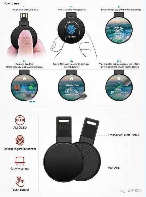 這款名為One-Step的智能U盤是針對人們拷貝資料時內(nèi)存不足,無意丟失U盤導致信息泄露等問題,通過將現(xiàn)有的重力傳感器,屏下指紋識別,OLED等技術(shù)與Shake、Hold、Touch手勢相結(jié)合,做到內(nèi)存顯示只需隨時一搖,指紋解鎖只需隨手一按,文件快速打印與轉(zhuǎn)移只需隨心一觸。One-step智能U盤提供的整合性解決方案,為用戶帶來全新有趣,前瞻性的交互體驗。
