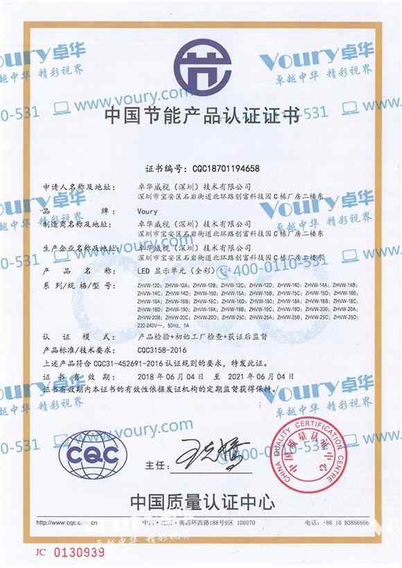 Voury卓華微間距、小間距LED顯示屏采用節(jié)能環(huán)保光源,光電轉(zhuǎn)換效率高、功耗低、抗輻射,使Voury卓華LED顯示屏產(chǎn)品獲得RoHS環(huán)保認證、FCC認證,通過一級能效檢測等。
