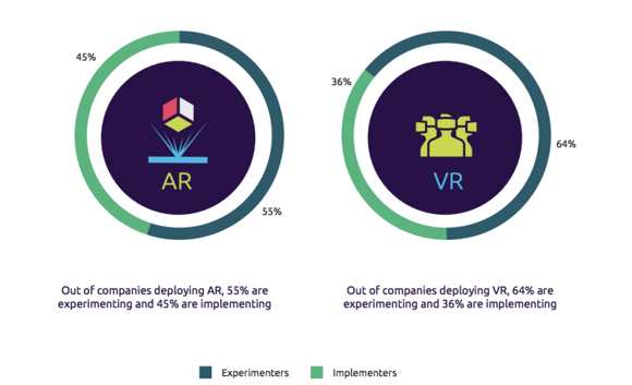凱捷的研究報(bào)告顯示,在接下來(lái)幾年里企業(yè)將會(huì)大批量采用AR/VR技術(shù),沒(méi)有使用這兩項(xiàng)技術(shù)的企業(yè)競(jìng)爭(zhēng)力相對(duì)較低。報(bào)告中的一個(gè)重點(diǎn)是,雖然企業(yè)對(duì)VR進(jìn)行的實(shí)驗(yàn)比AR多,但是對(duì)AR進(jìn)行應(yīng)用的企業(yè)更多。接觸VR的企業(yè)中有64%在對(duì)這項(xiàng)技術(shù)進(jìn)行實(shí)驗(yàn),而應(yīng)用VR的企業(yè)占36%,而實(shí)驗(yàn)AR技術(shù)的企業(yè)有55%,應(yīng)用的企業(yè)占45%。