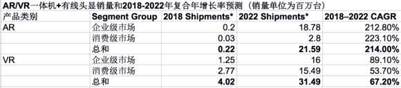 報(bào)告中稱(chēng),AR和VR一體機(jī)和有線(xiàn)頭顯全球銷(xiāo)量到2018年預(yù)計(jì)達(dá)420萬(wàn)臺(tái),與2017年相比提高31%。到2022年,銷(xiāo)量將增加到5310萬(wàn)臺(tái),復(fù)合年增長(zhǎng)率(CAGR)達(dá)88%。雖然目前眼鏡盒子占了大部分頭顯市場(chǎng),但是在2018到2022年之間銷(xiāo)量會(huì)下降,復(fù)合年增長(zhǎng)率降為-1%(不過(guò)外媒對(duì)此有所懷疑,畢竟三星為了宣傳Galaxy手機(jī)一直在免費(fèi)贈(zèng)送頭顯盒子)。