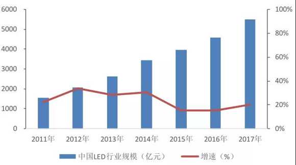 數(shù)據(jù)顯示:2011年以來,中國LED市場規(guī)?焖僭鲩L,從2011年的1540億元成長到2017年LED市場規(guī)模達到5509億元,復(fù)合增速達23.7%。