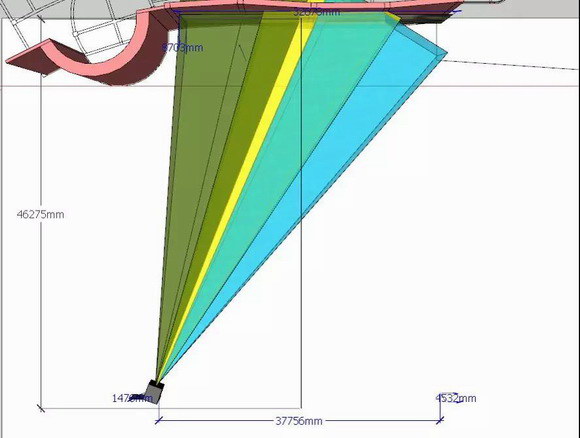 在第一版方案設(shè)計(jì)中整個(gè)畫面的顯示高度在8.5米-9米,寬度約為33米,投距約為45-48米,采用3臺(tái)松下激光工程投影機(jī)PT-SRZ31KC進(jìn)行整個(gè)光路覆蓋,配合三只ET-D75LE30(F值2.6-5.0:1)鏡頭,計(jì)算得出的屏前照度理論值超過200lux。