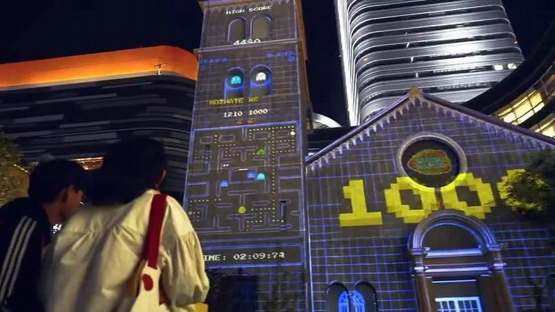 經(jīng)典IP “Pac-Man”,被利用3D 投影技術(shù),結(jié)合實時物理搖桿裝置,再現(xiàn)在這座鐘樓上,成為一臺巨型的建筑“游戲機”。