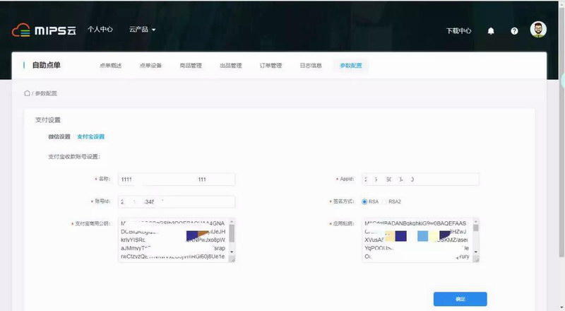 支持用戶進(jìn)行微信設(shè)置或者是支付寶設(shè)置。以支付寶收款賬號設(shè)置為例,支持設(shè)置名稱、賬號ID、AppID、簽名方式、支付寶商用公鑰及應(yīng)用私鑰。