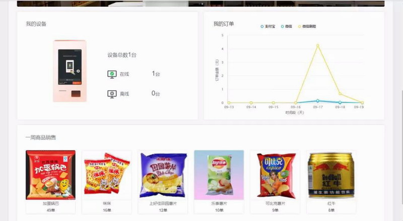 用戶可查看該賬戶下設(shè)備的總數(shù)以及在線、離線設(shè)備數(shù)量;微信二維碼、支付寶二維碼以及微信刷臉支付訂單的統(tǒng)計(jì)數(shù)據(jù);一周商品銷量統(tǒng)計(jì)數(shù)據(jù)。