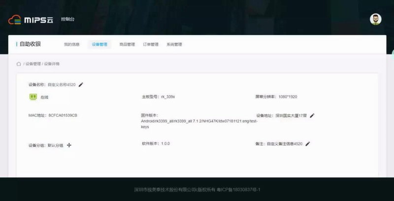 并可在查看指定設(shè)備的詳細(xì)信息,包括MAC地址、主板型號、屏幕分辨率、固件版本、軟件版本等信息,并可在線修改設(shè)備名稱、設(shè)備地址以及自定義備注信息。