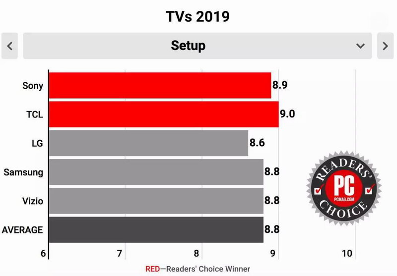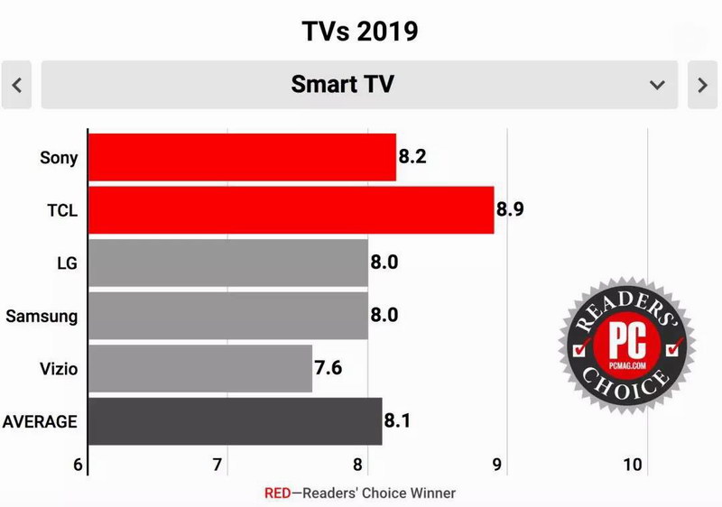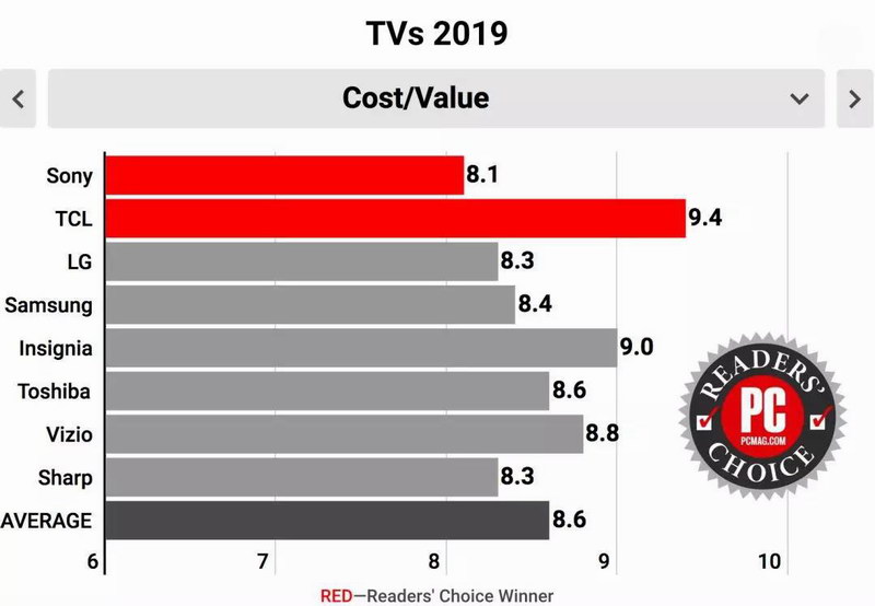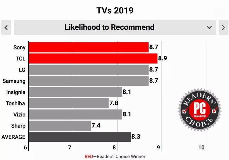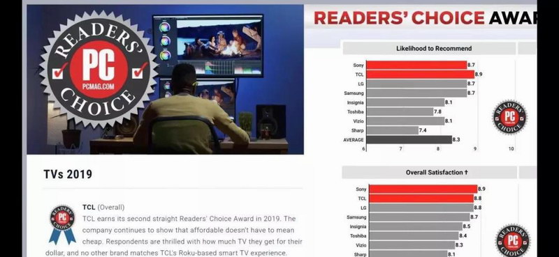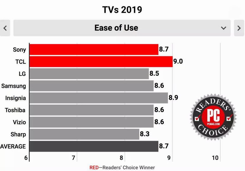 這也是TCL連續(xù)第二次獲得該獎項了,在2018年P(guān)CMag發(fā)起的調(diào)查活動中TCL以8.9分(從0(非常不滿意)到10(非常滿意))的優(yōu)異評分,占據(jù)了分數(shù)排行榜的首位。TCL從索尼、三星、LG等多位實力強勁的家電品牌中拿下第一,說明外國小伙伴非常信賴TCL電視產(chǎn)品的品質(zhì)。