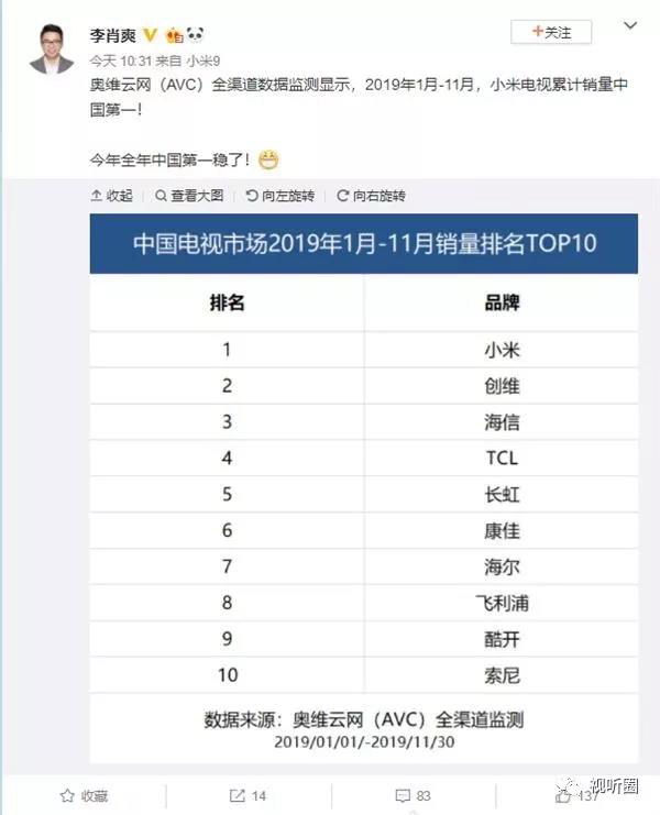 12月20日,小米電視部總經(jīng)理@李肖爽公布了一條關(guān)于小米電視的好消息:奧維云網(wǎng)(AVC)全渠道數(shù)據(jù)監(jiān)測顯示,2019年1月-11月,小米電視累計銷量中國第一。有了前11月的市場優(yōu)異成績的鋪墊,李肖爽甚至自信的表示:“今年全年中國第一穩(wěn)了!”