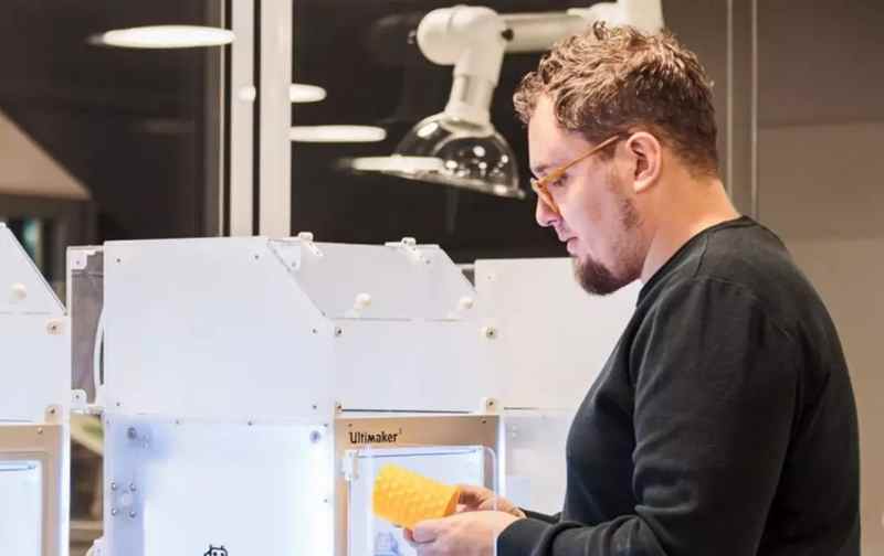 工作臺(tái)上放有縫紉機(jī)、胸章機(jī)、3D打印機(jī)、