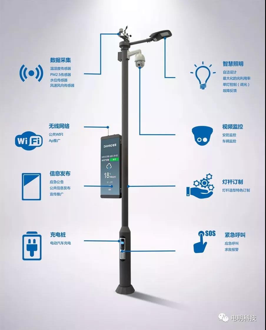 隨著智慧城市建設(shè)工作的不斷深入,路燈照明系統(tǒng)作為市政建設(shè)的重要基礎(chǔ)設(shè)施,早已不再是簡單的照明工程,而是城市物聯(lián)網(wǎng)的端口,將發(fā)揮更大的“綜合體”作用,讓智慧城市的建設(shè)更好的落地。在智慧城市建設(shè)發(fā)展的大背景下,智慧路燈應(yīng)運而生。智慧路燈實現(xiàn)了如充電樁、LED信息發(fā)布屏、高清攝像頭、應(yīng)急報警、5G基站搭載網(wǎng)絡(luò)、停車檢測、環(huán)境感知、積水監(jiān)測、網(wǎng)絡(luò)音像等功能,利用物聯(lián)網(wǎng)及互聯(lián)網(wǎng)技術(shù),使路燈成為智慧城市信息采集終端和便民服務(wù)終端。電明科技抓住時代機遇,通過多年的道路照明行業(yè)經(jīng)驗,結(jié)合在LED路燈、
