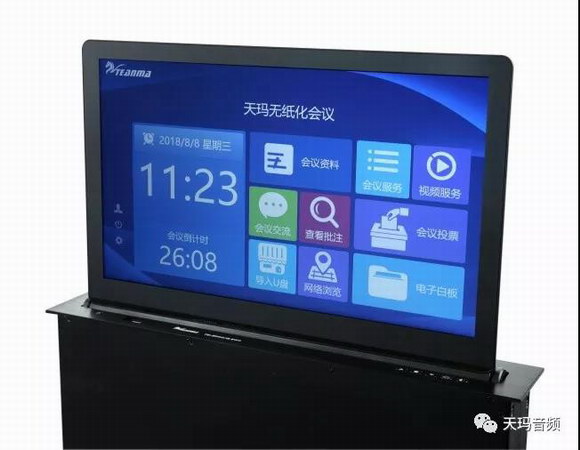 天瑪無(wú)紙化會(huì)議系統(tǒng)硬件上配置了高清超薄液晶屏升降設(shè)控,在觸摸屏上操作,能很快上手適應(yīng)。該顯示屏背面還配有一個(gè)液晶屏與一般普通辦公用的顯示屏可不一樣,它采用的是雙面屏設(shè)計(jì),前面的主屏顯示會(huì)議內(nèi)容,全視角顯示,支持多點(diǎn)觸摸桌牌副屏,主要顯示參會(huì)人員的姓名、職位等信息,桌牌整體顯示醒目,而且后臺(tái)信息編輯方便,可統(tǒng)一修改格式字體等,電子化桌牌替代了傳統(tǒng)的紙質(zhì)桌牌,彰顯科技環(huán)保。
