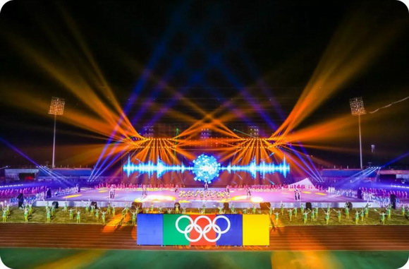 黃岡市第五屆運(yùn)動(dòng)會(huì)開(kāi)幕式在蘄春縣奧體中心體育場(chǎng)舉行,開(kāi)幕式燈光使用了歐瑪LED切割燈(ARES-P7II)64臺(tái);其中面光32臺(tái),逆光32臺(tái),三合一電腦燈(Moore380)100臺(tái);LED蜂眼染色燈(Eos-B19)100臺(tái)。