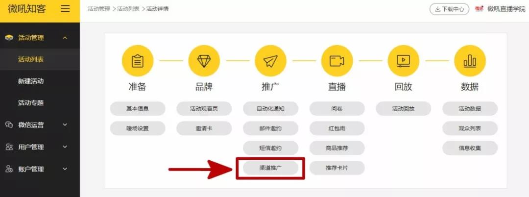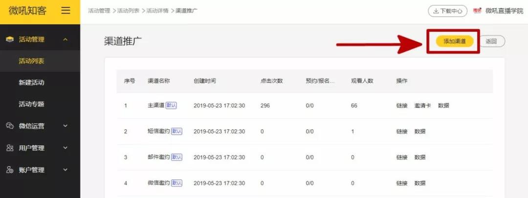 微吼知客新版本新增了【渠道管理】能力,不僅覆蓋了通用的郵件、短信、微信渠道,還可任意添加如企業(yè)官網(wǎng)、百度SEO等自定義渠道。更為重要的是,企業(yè)運(yùn)營者添加的自定義渠道也將收集到用戶行為數(shù)據(jù)。