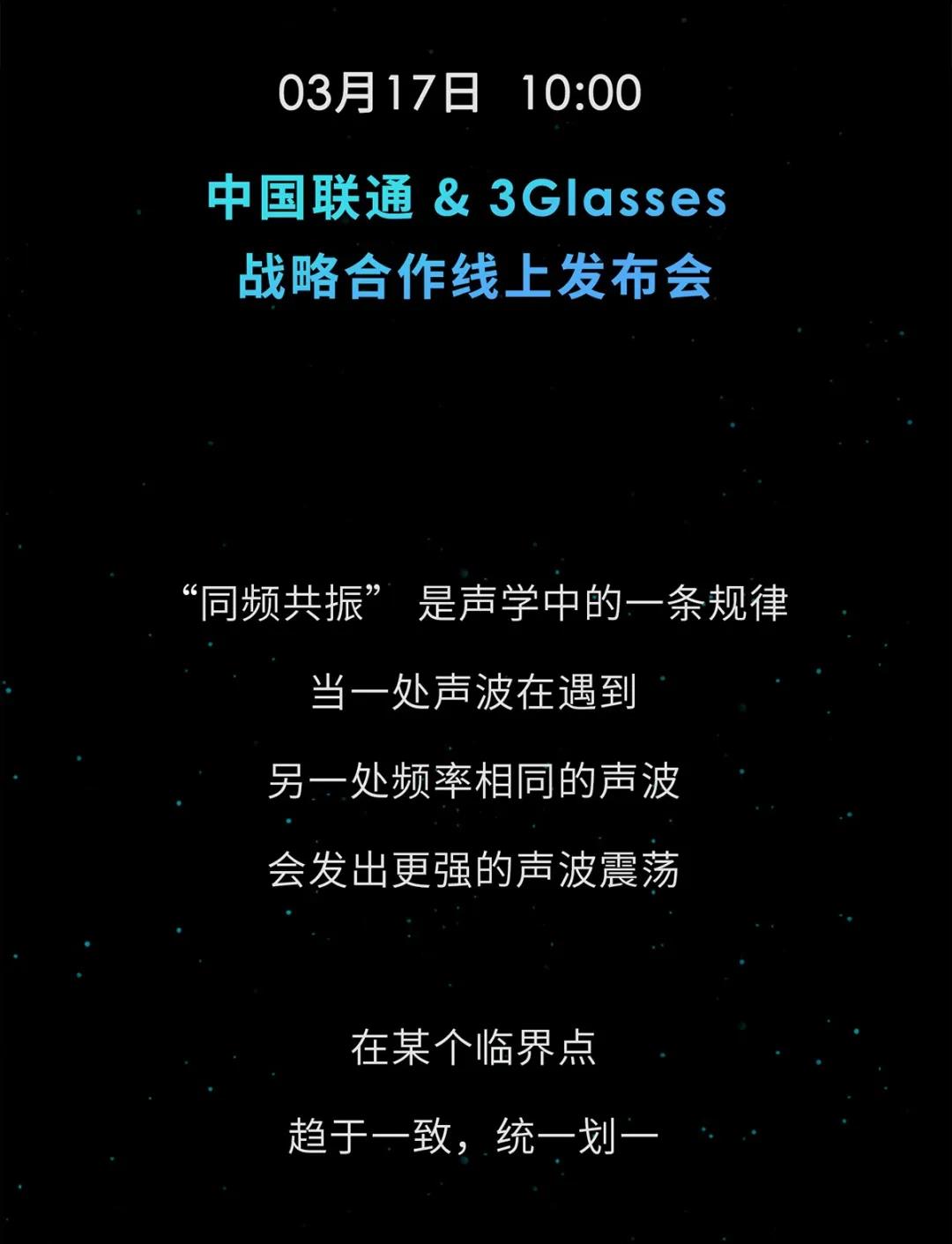 中國聯(lián)通 & 3Glasses 戰(zhàn)略合作線上發(fā)布會 | 3.17 同頻共振,萬物相連