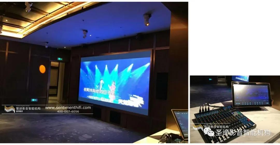 線陣列系統圍繞LED電子屏按上下左右布局,共計4只,同時搭配一只卡拉OK的重低音揚聲器。揚聲器外觀與室內美學設計相結合,全部于裝飾面后方,做隱藏設計。