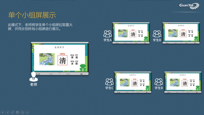 展示模式:老師主屏自帶控制功能,可輕松調(diào)取小組屏幕至主屏,其他小組屏默認(rèn)自動(dòng)同步顯示