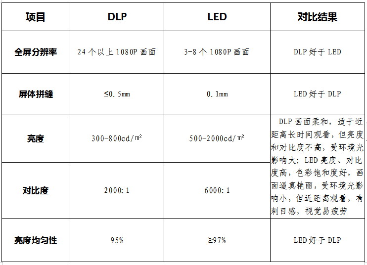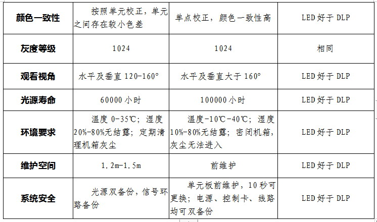 項目 DLP LED 對比結(jié)果 全屏分辨率 24個以上1080P畫面 3-8個1080P畫面 DLP好于LED 屏體拼縫 ≤0.5mm 0.1mm LED好于DLP 亮度 300-800cd/㎡ 500-2000cd/㎡ DLP畫面柔和,適于近距離長時間觀看,但亮度和對比度不高,受環(huán)境光影響大;LED亮度、對比度高,色彩飽和度好,畫面逼真艷麗,受環(huán)境光影響小,但近距離觀看,有刺目感,視覺易疲勞 對比度 2000:1 6000:1 亮度均勻性 95% ≥97% LED好于DLP 顏色一致性 按照單元校正,單元之間存在較小色差 單點校正,顏色一致性高 LED好于DLP 灰度等級 1024 1024 相同 觀看視角 水平及垂直120-160° 水平及垂直大于160° LED好于DLP 光源壽命 60000小時 100000小時 LED好于DLP 環(huán)境要求 溫度0-35℃;濕度20%-80%無結(jié)露;定期清理機(jī)箱灰塵 溫度-10℃-40℃;濕度10%-80%無結(jié)露;密閉機(jī)箱,灰塵無法進(jìn)入 LED好于DLP 維護(hù)空間 1.2m-1.5m 前維護(hù) LED好于DLP 系統(tǒng)安全 光源雙備份,信號環(huán)路備份 單元板前維護(hù),10秒可更換;電源、控制卡、線路均可雙備份 LED好于DLP