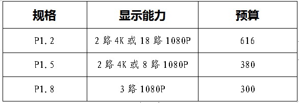 規(guī)格 顯示能力 預(yù)算 P1.2 2路4K或18路1080P 616 P1.5 2路4K或8路1080P 380 P1.8 3路1080P 300