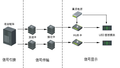 綜合以上各因素,結(jié)合廠家LED大屏模組規(guī)格,確定大屏寬度為12.10m±0.1m,高度為3.41m±0.1m。 (三)確定顯示系統(tǒng)架構(gòu)