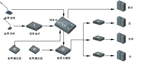 該會議廳一般用于召開會議、演訓(xùn)導(dǎo)演、觀看錄像、演講授課等活動,采用2.1聲道系統(tǒng)即可滿足需求,同時為確保重大演訓(xùn)活動時的會議保障安全,需采用主備在線設(shè)計。