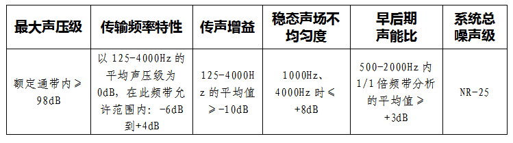 最大聲壓級 傳輸頻率特性 傳聲增益 穩(wěn)態(tài)聲場不均勻度 早后期 聲能比 系統(tǒng)總噪聲級 額定通帶內(nèi)≥98dB 以125-4000Hz的平均聲壓級為0dB,在此頻帶允許范圍內(nèi):-6dB到+4dB 125-4000Hz的平均值≥-10dB 1000Hz、4000Hz時≤+8dB 500-2000Hz內(nèi)1/1倍頻帶分析的平均值≥+3dB NR-25