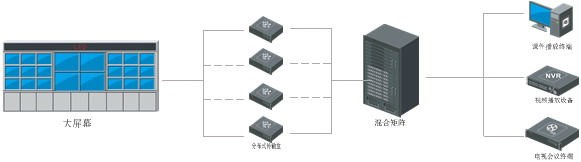信號管理系統(tǒng)的核心是視頻矩陣,有分布式和集中式兩大類。分布式采用IP網(wǎng)絡(luò)傳輸、交換、控制視頻信號,具有擴(kuò)展靈活、傳輸距離遠(yuǎn)的特點。集中式矩陣一般集中部署在機(jī)房,使用高清或標(biāo)清視頻線匯聚視頻信號,集中進(jìn)行交換、轉(zhuǎn)換和控制,傳輸距離不及分布式,但性價比高,便于集中管控。 根據(jù)現(xiàn)場勘查和功能需求,采取集中和分布式相結(jié)合方式,在機(jī)房布設(shè)64*64路集中式矩陣1部,同時在距離較遠(yuǎn)的顯示大屏側(cè)布設(shè)分布式傳輸盒,用于傳輸大屏顯示信號。